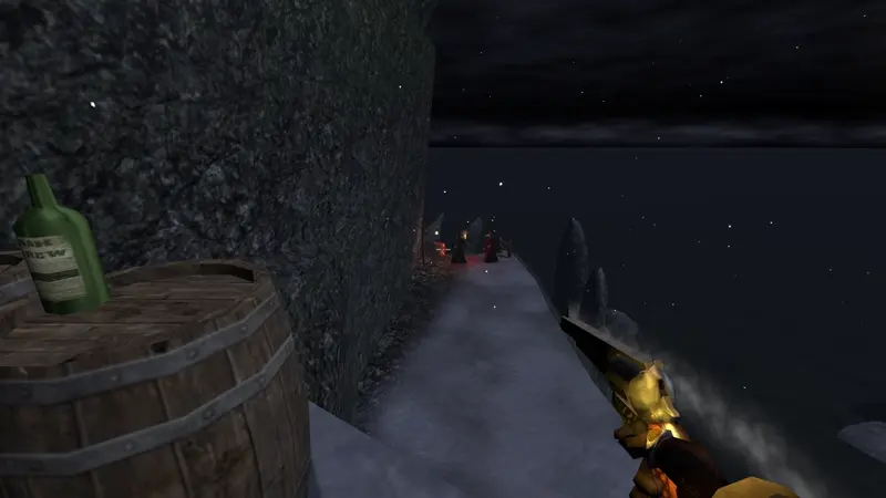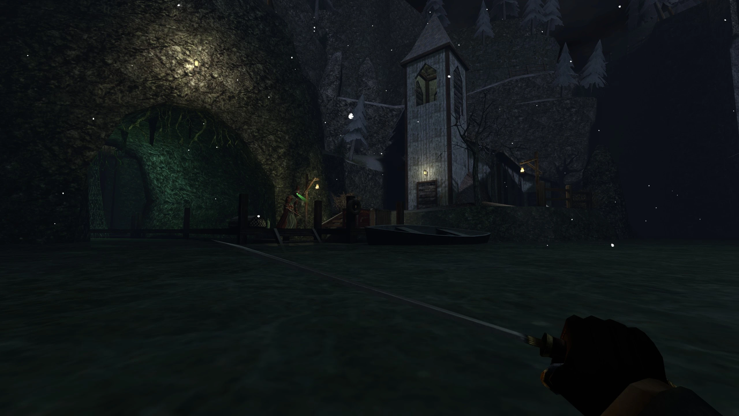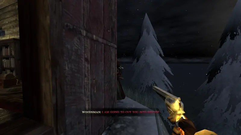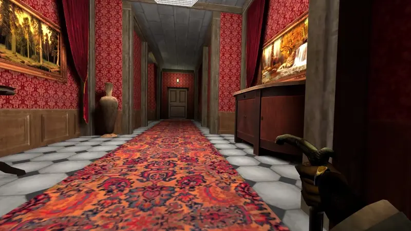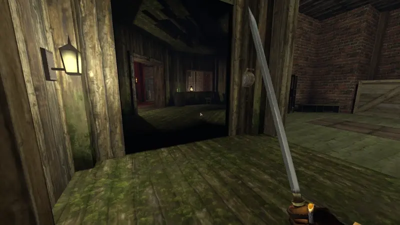 To keep you out of trouble, you'll have to move in the dark: the game features a light and sound system, with different surfaces producing different levels of noise, and light sources casting very defined shadows (thanks to Gloomwood's early 00s aesthetic) that you can hide in.